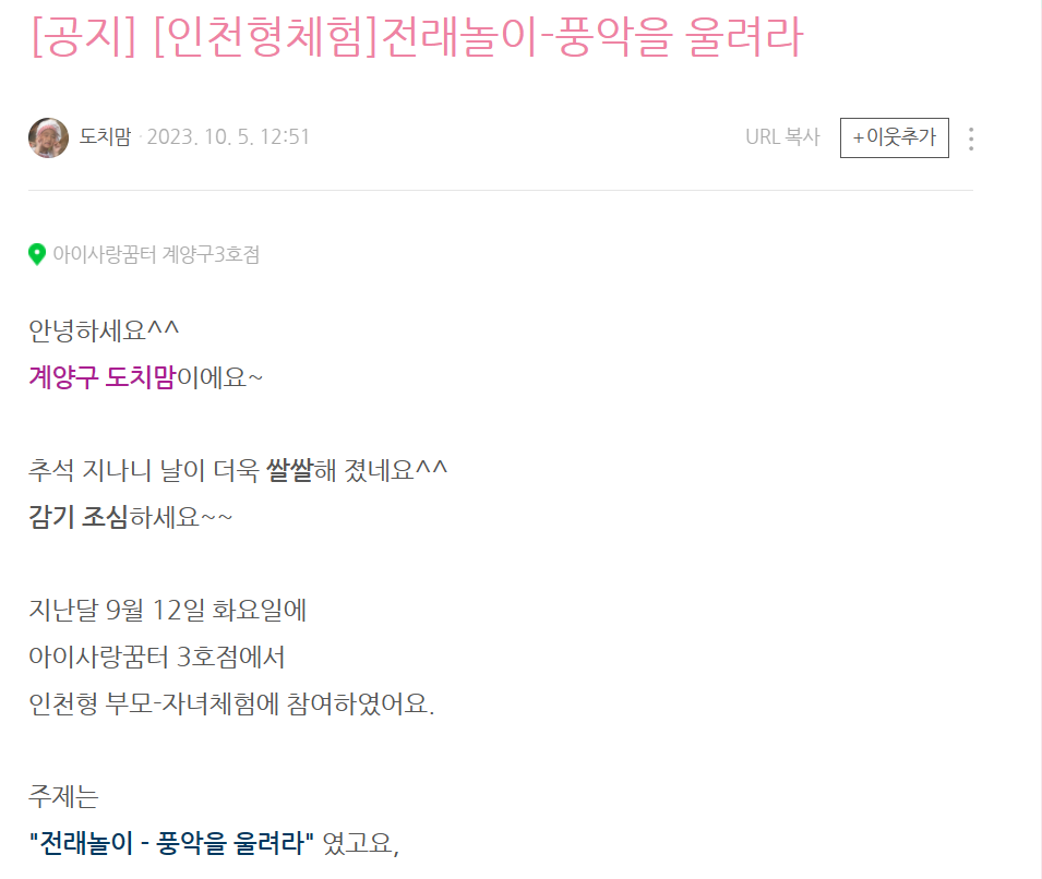 [부모SNS홍보단-계플루언서(9월)] 인천형 부모-자녀체험 참여 후기