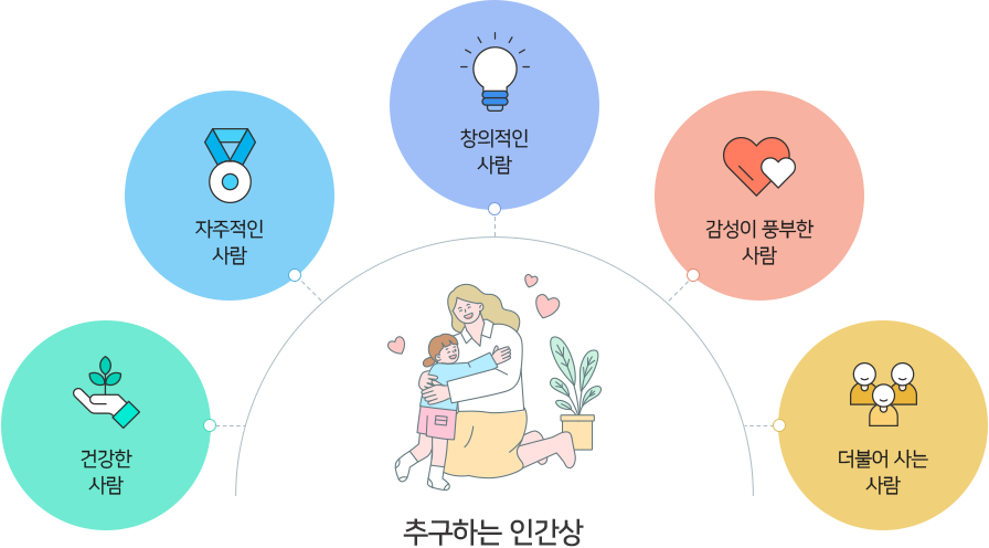 | 3~5세 | 자신의 소중함을 알고 건강하고 안전한 생활습관을 기른다 | 자신의 일을 스스로 해결하는 기초능력을 기른다 | 호기심과 탐구심을 가지고 상상력과 창의력을 기른다 | 일상에서 아름다움을 느끼고 문화적 감수성을 기른다 | 사람과 자연을 존중하고 배려하며 소통하는 태도를 기른다 | ||