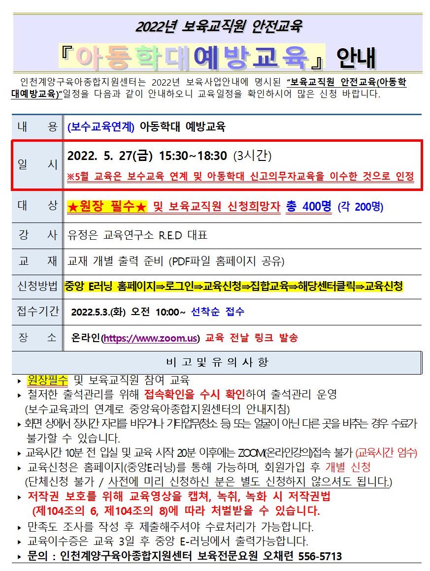 | 교육기간 | 2022-05-27(금) 15시30분 ~ 2022-05-27(금) 18시30분 | ||