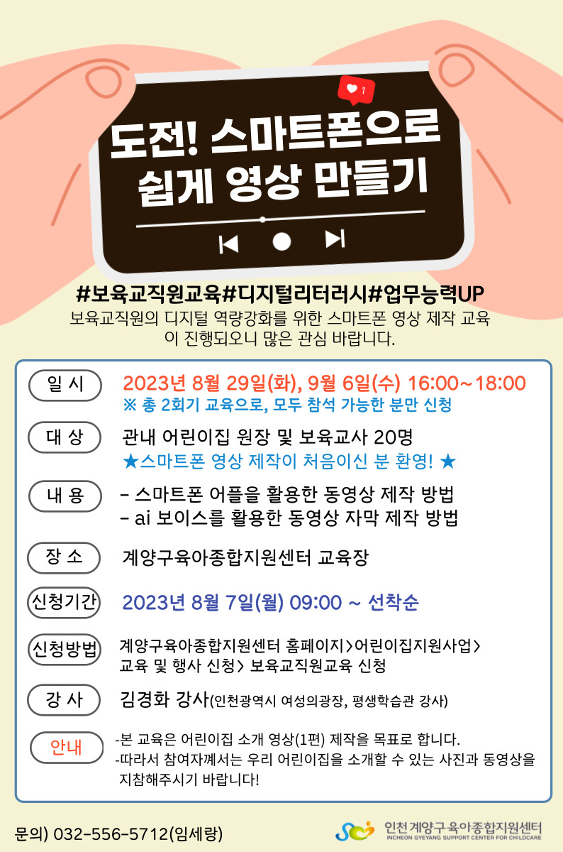| 기타사항 | -8/29(화), 9/6(수) 2회기 모두 참석해야 합니다. -대면교육입니다. |