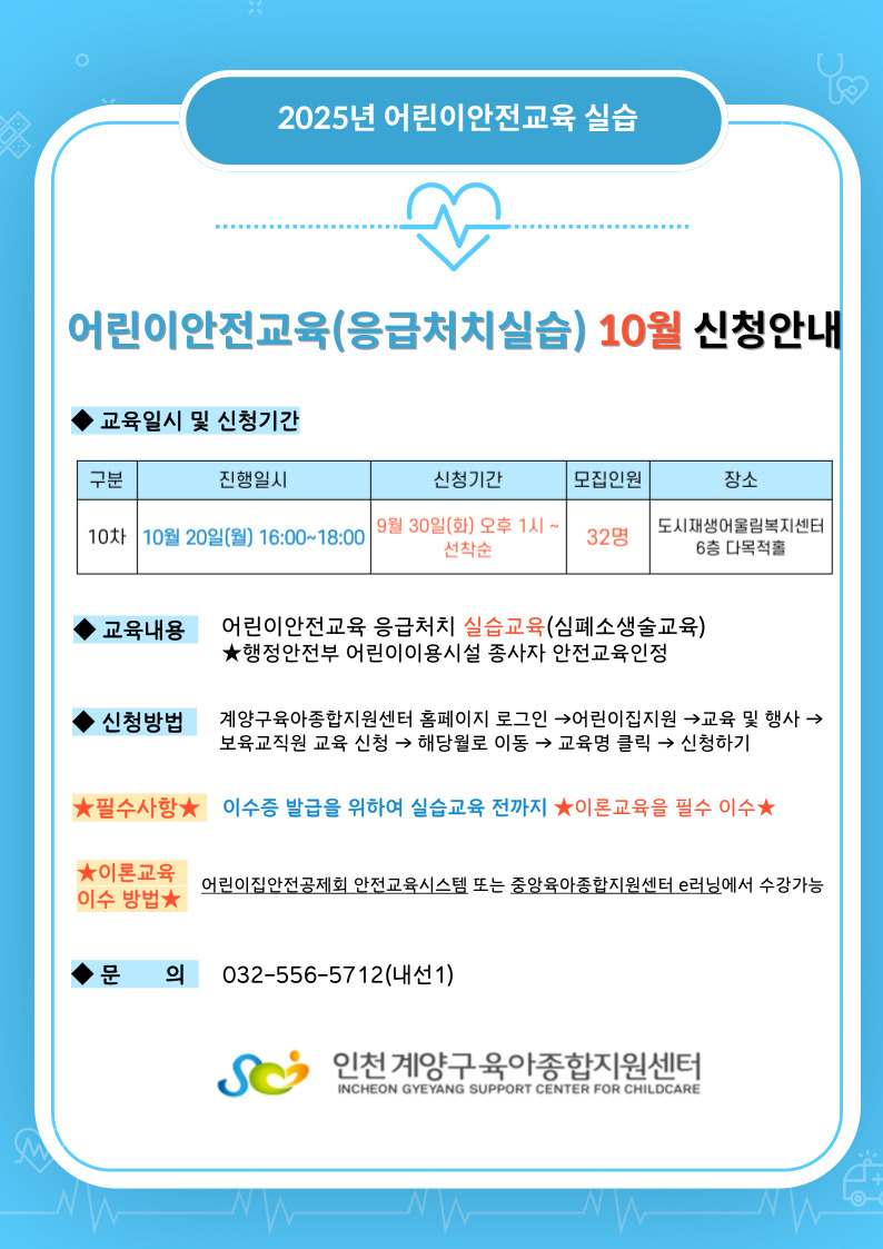 [10/20(월) 16시] 어린이 이용시설 종사자 안전교육(응급처치 실습교육)