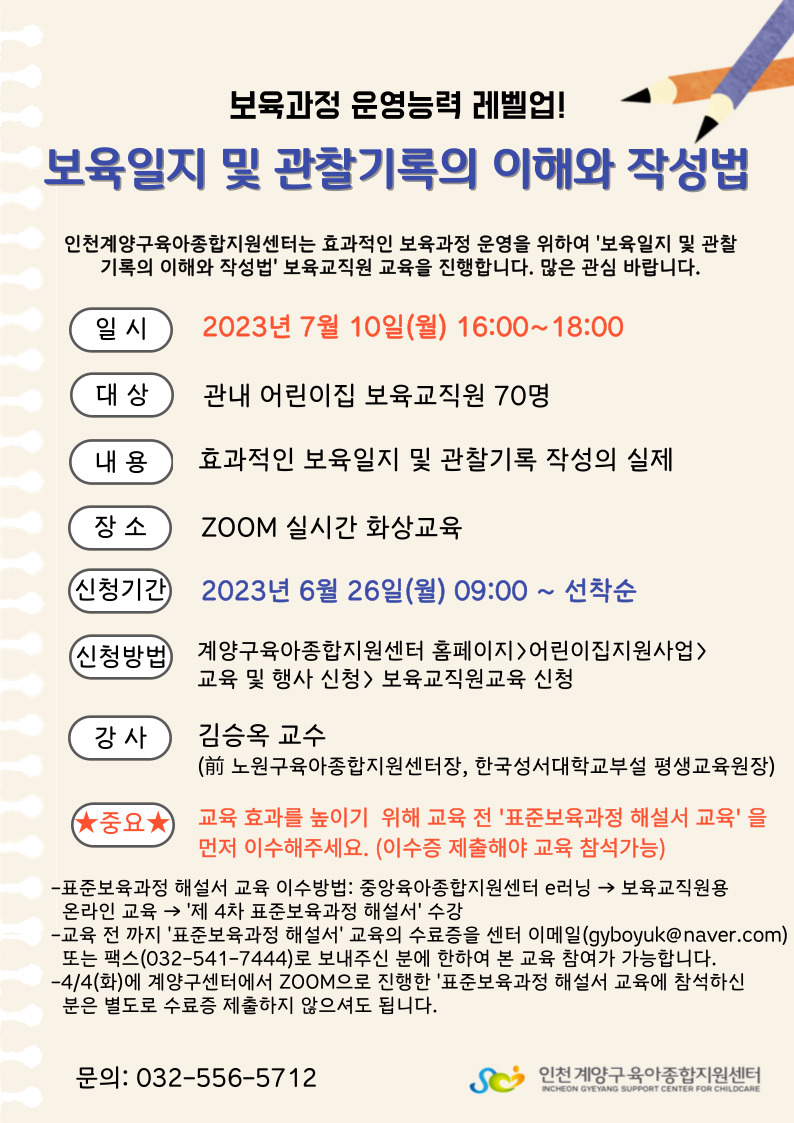 | 기타사항 | -ZOOM 교육입니다. -교육 참석 전 표준보육과정 해설서 교육을 먼저 이수하시고 이수증을 센터 메일(gyboyuk@naver.com) 또는 팩스(032-541-7444)로 보내주세요. |