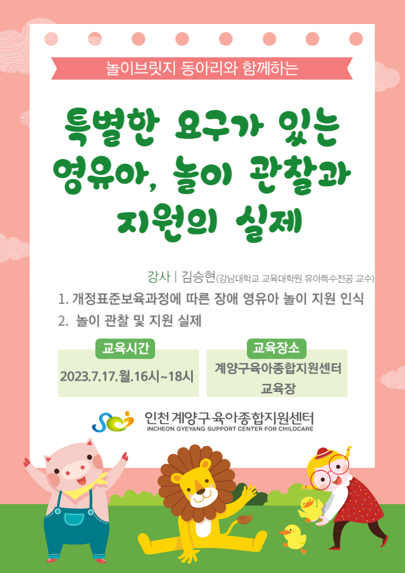 | 기타사항 | * 본 교육은 계양구육아종합지원센터 원장 동아리 [놀이브릿지]에서 주최하는 교육입니다. * |