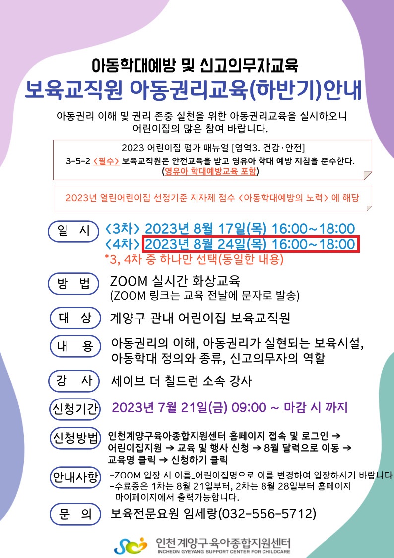 | 기타사항 | 이 교육은 법정의무교육, 평가제, 열린어린이집 지자체점수의 아동학대예방교육으로 인정되는 인정되는 교육입니다. | ||