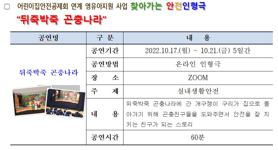 | 장소 | 온라인(ZOOM) | 공연팀 | 어린이집 안전공제회 |