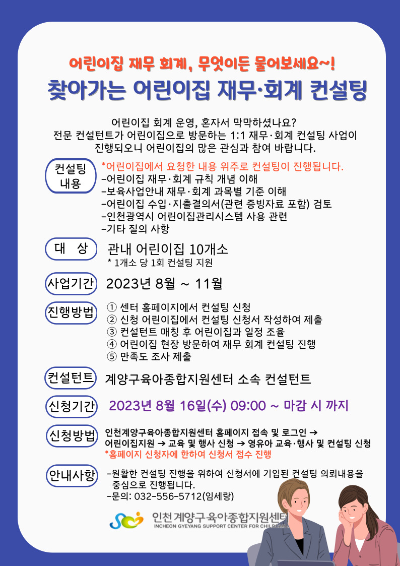 | 유의사항 | -컨설팅 내용, 컨설팅 일정 조율을 위해 신청하신 어린이집에 개별 연락 드립니다. | ||
