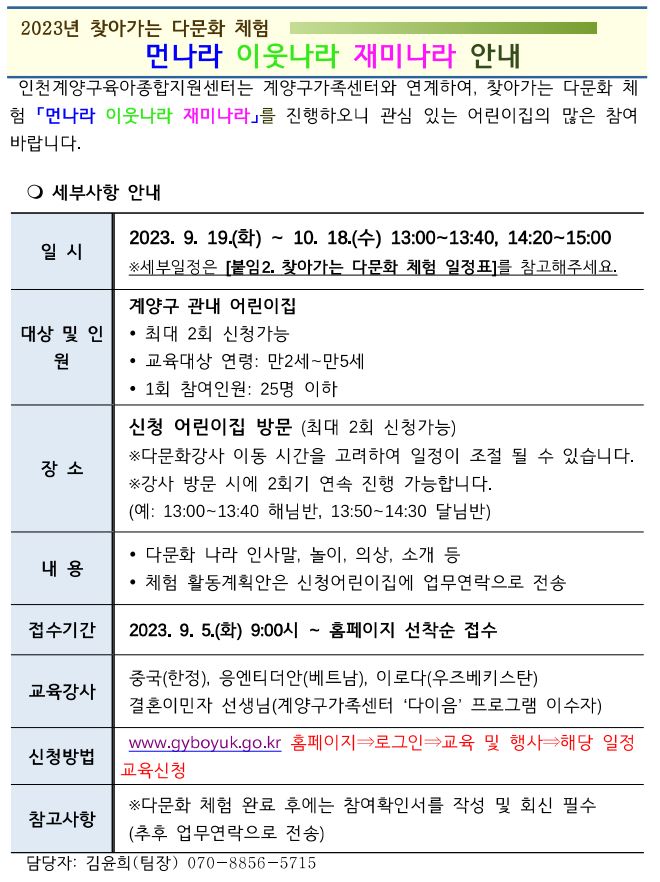 | 장소 | 신청 어린이집으로 방문 | 공연팀 | 가족센터 다이음 강사 |