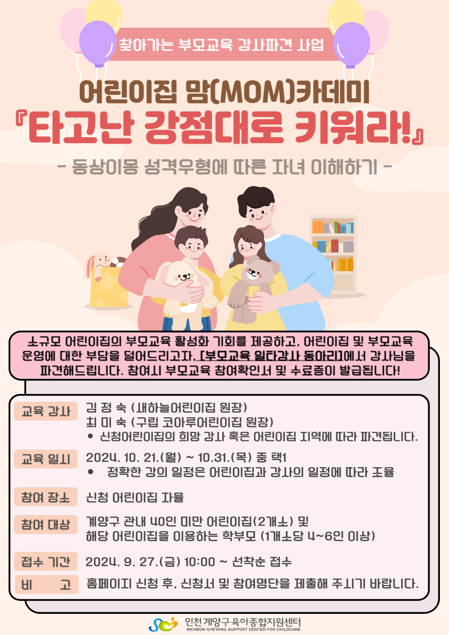 | 장소 | 신청 어린이집 자율 | 공연팀 | 부모교육 일타강사 동아리 소속 강사 |