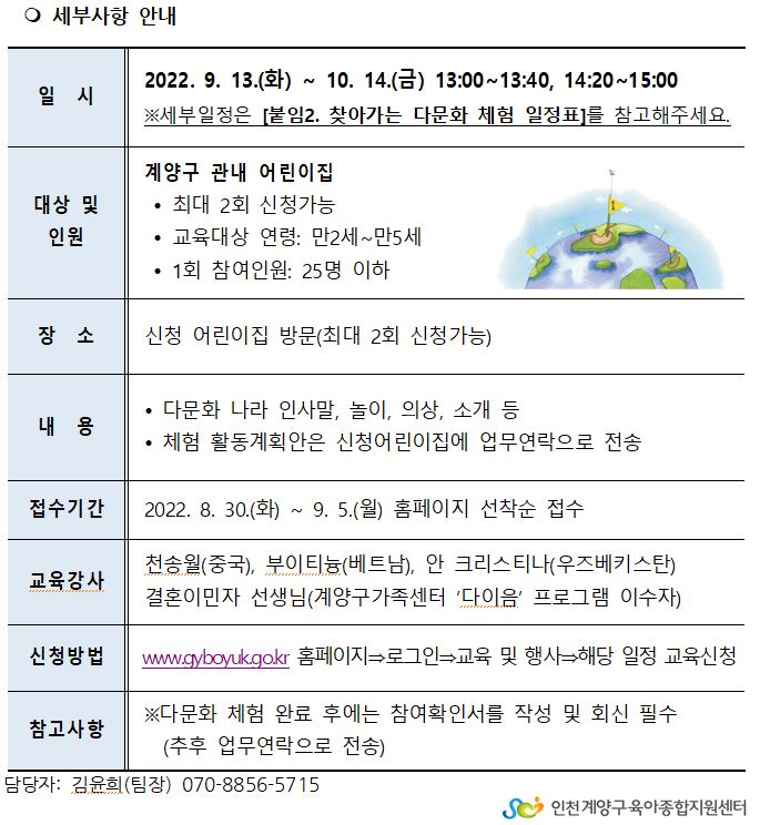 | 유의사항 | * 신청시에 "교사 1명"으로 신청해 주세요(추후에 참여 인원 요청 드립니다). ※ 내용: 다문화 나라 인사말, 놀이, 의상, 소개 등 ※ 체험 활동계획안은 신청어린이집에 업무연락으로 전송 ※ 다문화 체험 완료 후에는 참여확인서를 작성 및 회신 필수 |