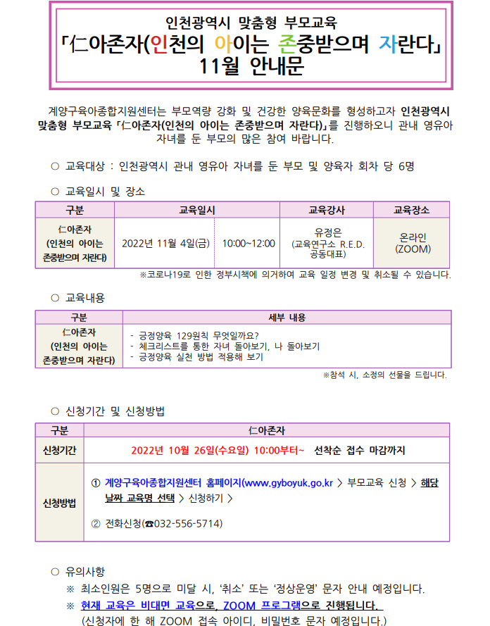 인천광역시 맞춤형 부모교육 仁아존자(인천의 아이는 존중받으며 자란다) 3차