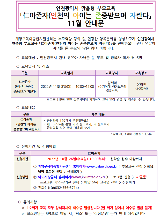 인천광역시 맞춤형 부모교육 仁아존자(인천의 아이는 존중받으며 자란다) 5차