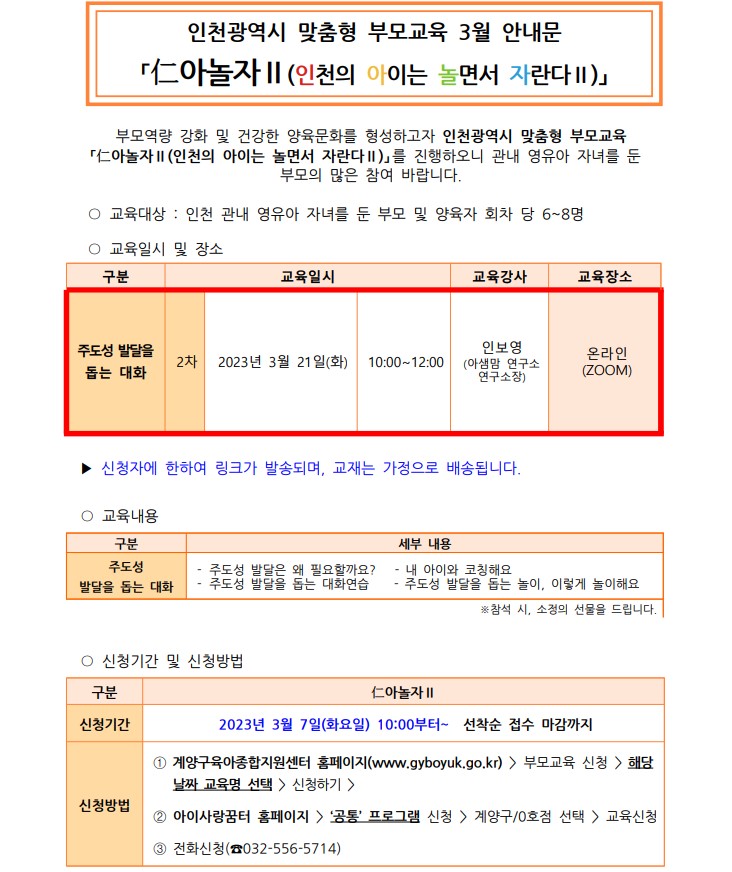 인천광역시 맞춤형 부모교육 인아놀자Ⅱ-주도성 발달을 돕는 대화기법