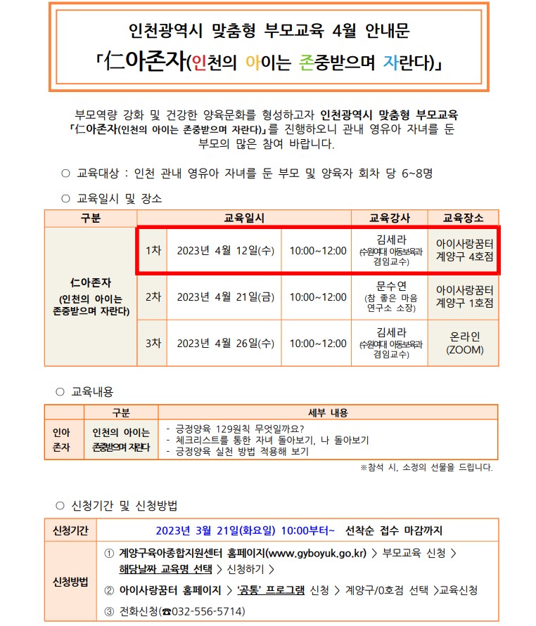 ★ 4월 12일(수) 오전 10시 <아이사랑꿈터 계양구 4호점>에서 진행됩니다.