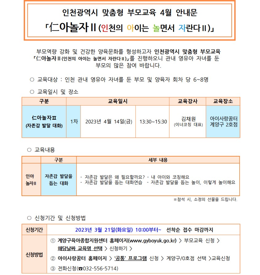 ★ 4월 14일(금) 오후 1시 30분 <아이사랑꿈터 계양구 2호점>에서 진행됩니다.