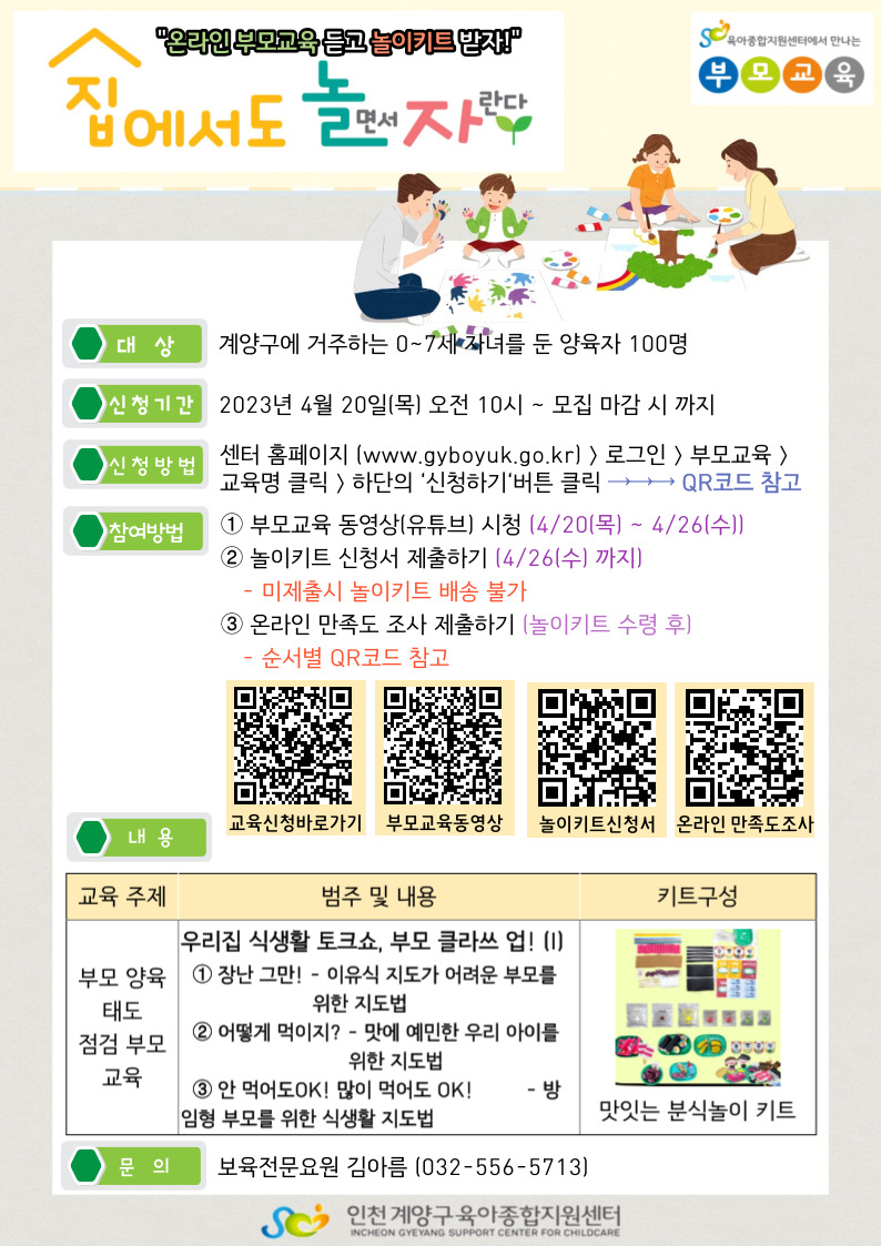 | 기타사항 | 상기 일정은 센터 사정에 의해 변경될 수 있습니다. ※ 계양구 거주 중인 0~7세 자녀 부모(양육자)만 신청가능 ※ 한 가정당 한 분만 신청 가능 |