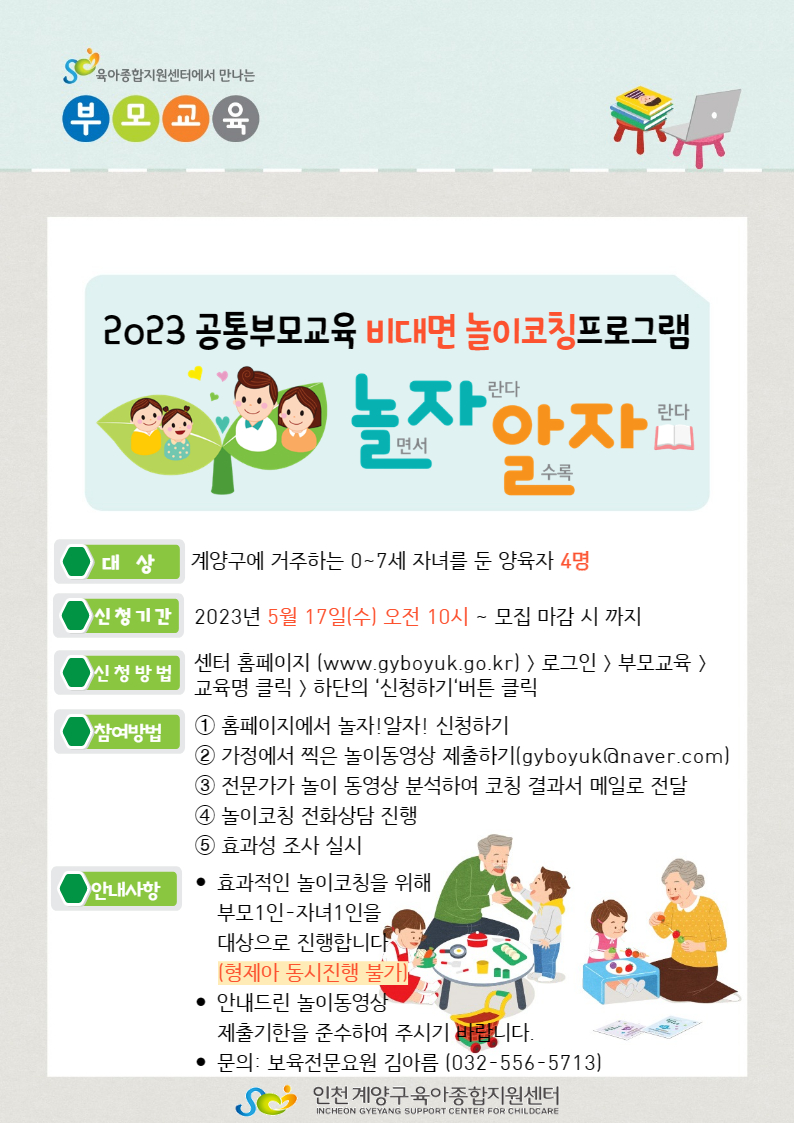 | 기타사항 | 홈페이지에서 신청 후 가정에서 찍으신 놀이동영상을 센터메일(gyboyuk@naver.com)로 보내주시면 전문가가 분석 후 놀이코칭 결과서를 메일로 보내드리고 전화상담이 진행되는 프로그램입니다. 많은 관심 부탁드립니다! |