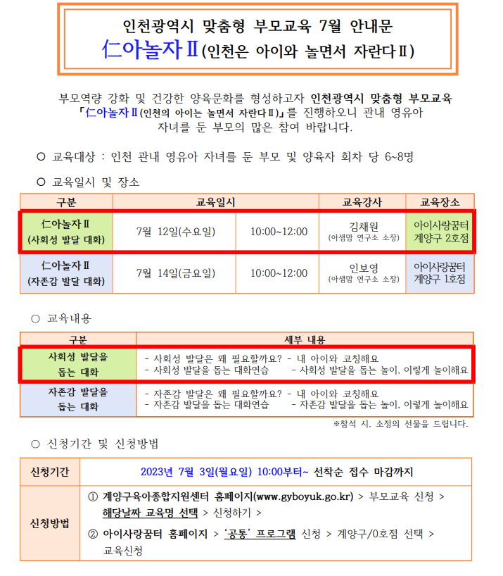 인천광역시 맞춤형 부모교육 仁아놀자Ⅱ-사회성 발달을 돕는 대화기법