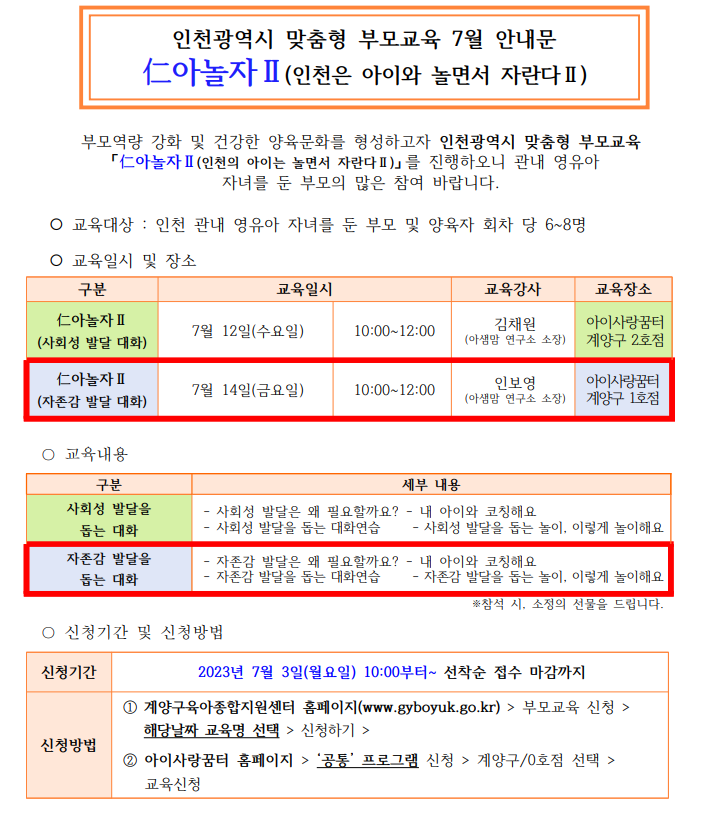 인천광역시 맞춤형 부모교육 仁아놀자Ⅱ-자존감 발달을 돕는 대화기법