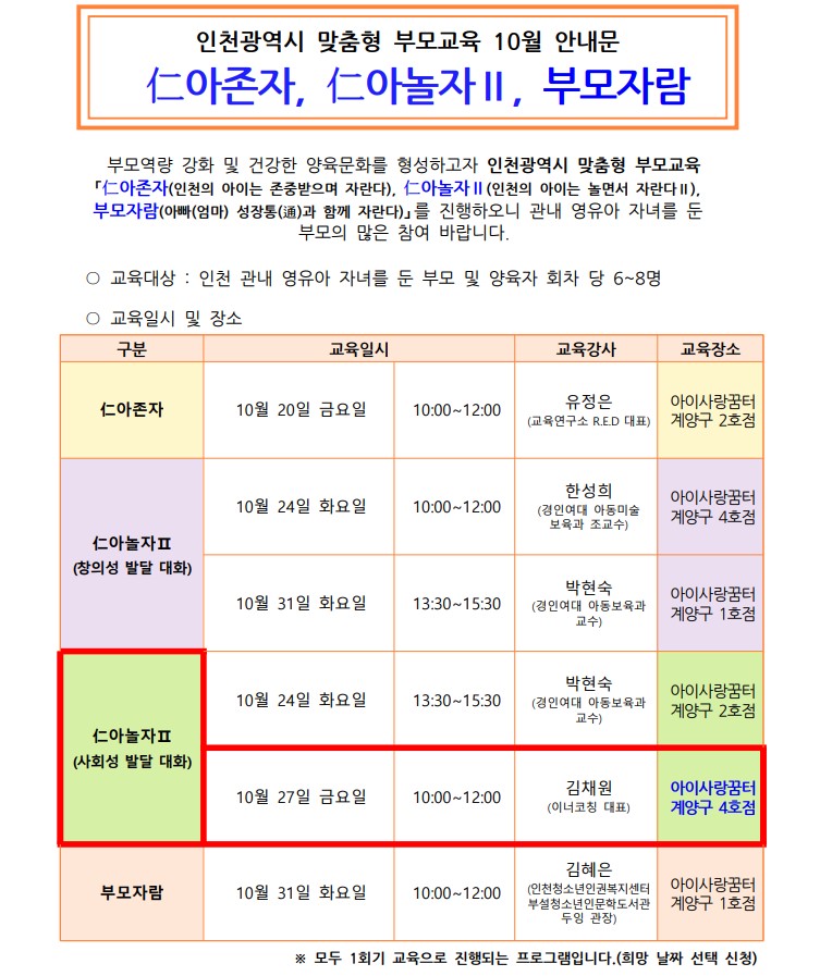 10/27(금) 오전 10시~12시, 아이사랑꿈터 계양구 4호점에서 진행