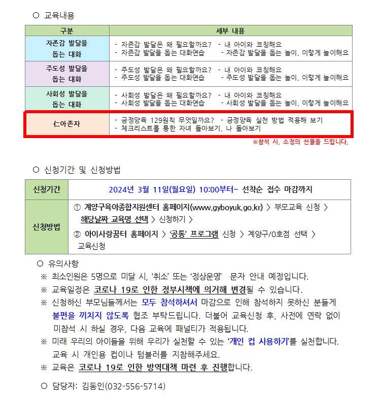 | 접수대상 | 원장, 보육교직원, 부모, 일반 | 정원 | 6명 (신청: 6) |