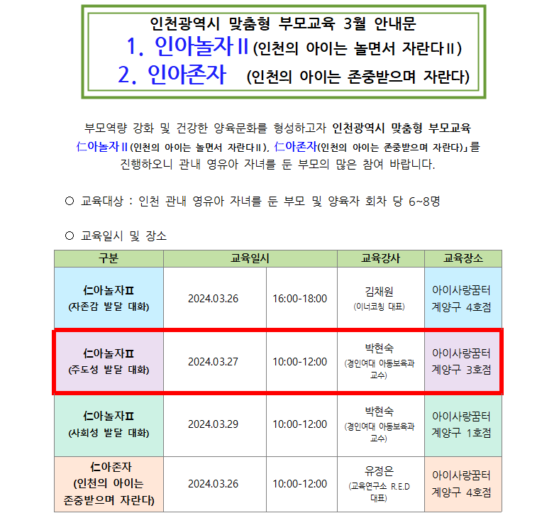 * 3월 27일(수) 오전 10시 ~ 12시, 아이사랑꿈터 계양구 3호점에서 진행됩니다.