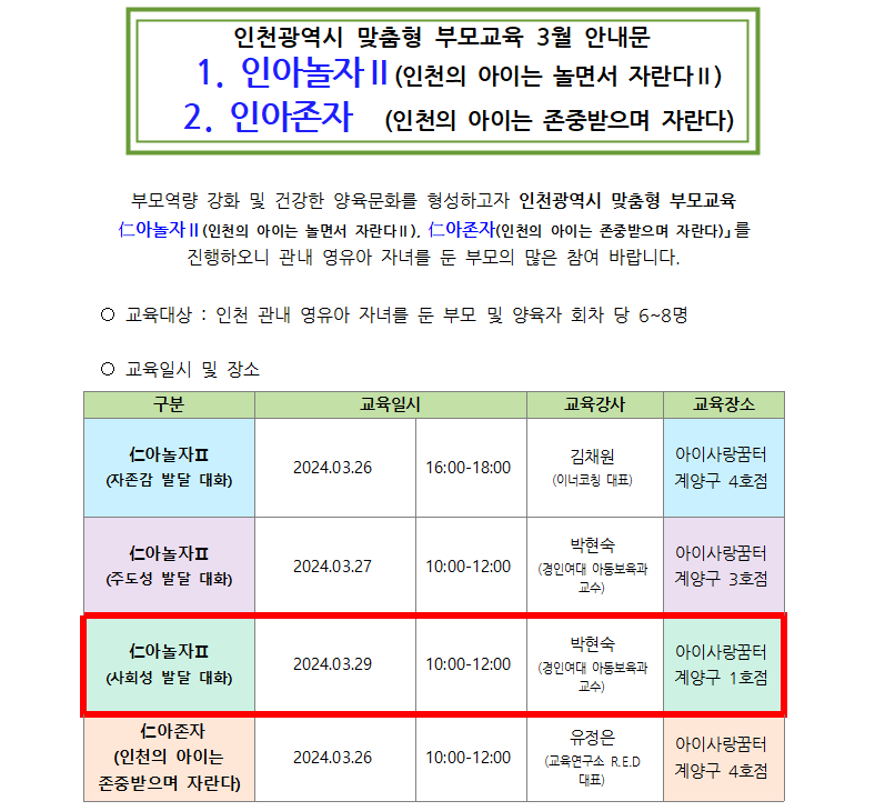인천광역시 맞춤형 부모교육 仁아놀자Ⅱ- 사회성 발달을 돕는 대화기법