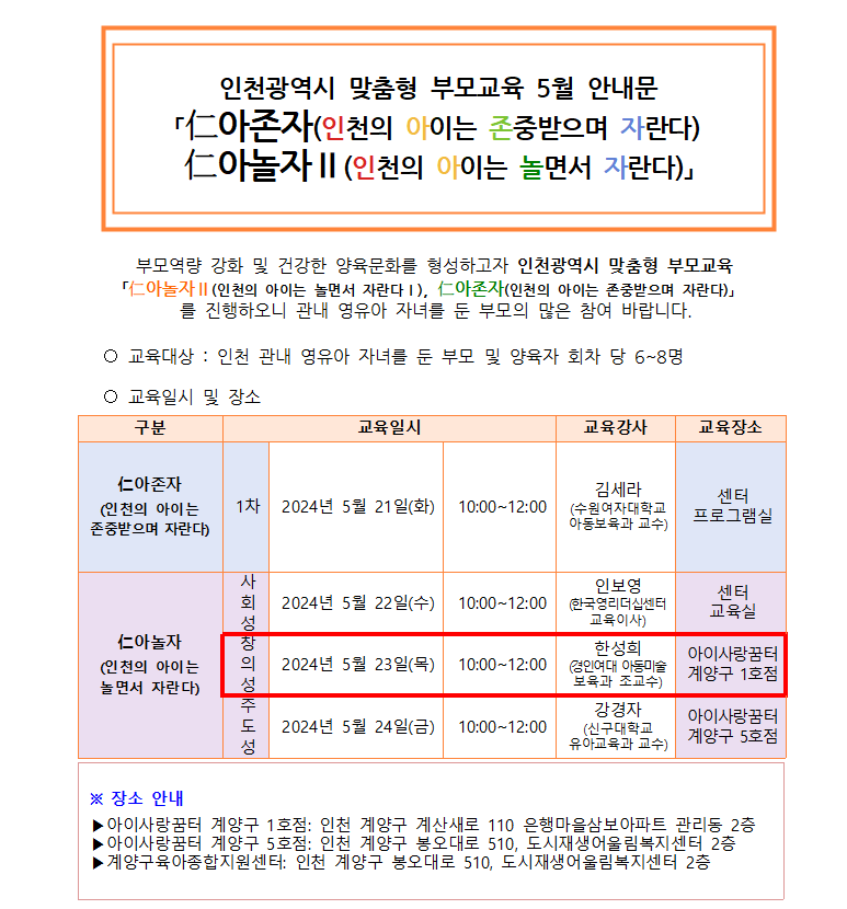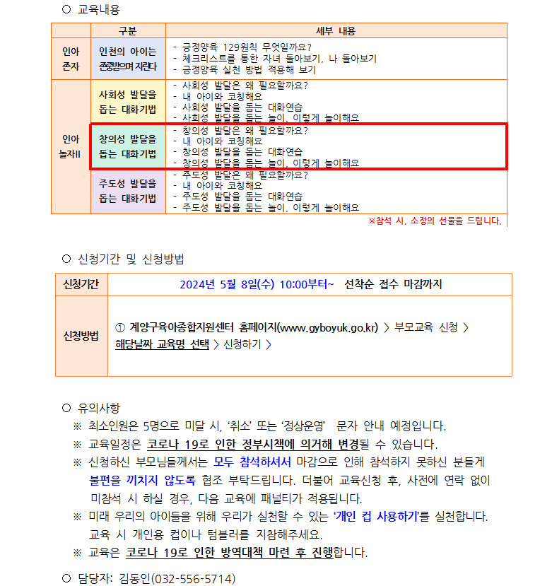 ★취소★ 인천광역시 맞춤형 부모교육 仁아놀자Ⅱ-창의성 발달을 돕는 대화기법