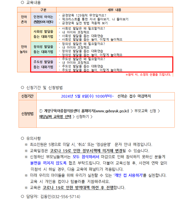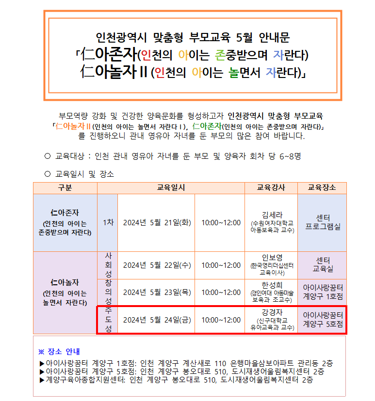 ★취소 ★ 인천광역시 맞춤형 부모교육 仁아놀자Ⅱ-주도성 발달을 돕는 대화기법