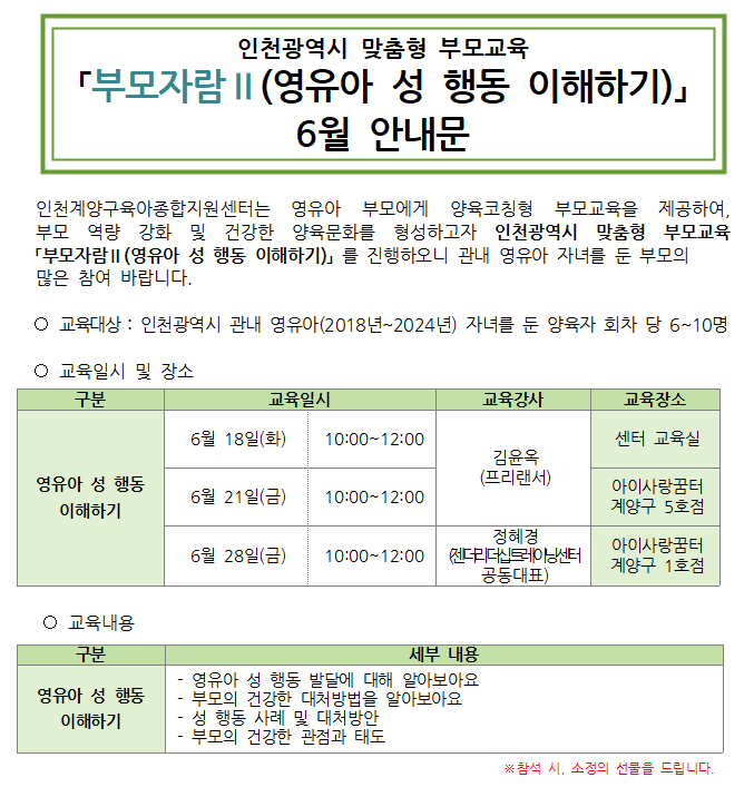 인천광역시 맞춤형 부모교육 부모자람2 (영유아 성행동 이해하기)