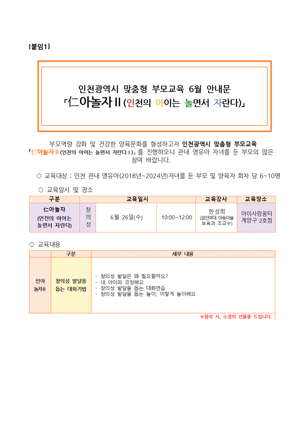 인천광역시 맞춤형 부모교육 仁아놀자Ⅱ-창의성 발달을 돕는 대화