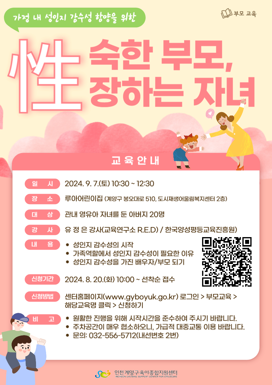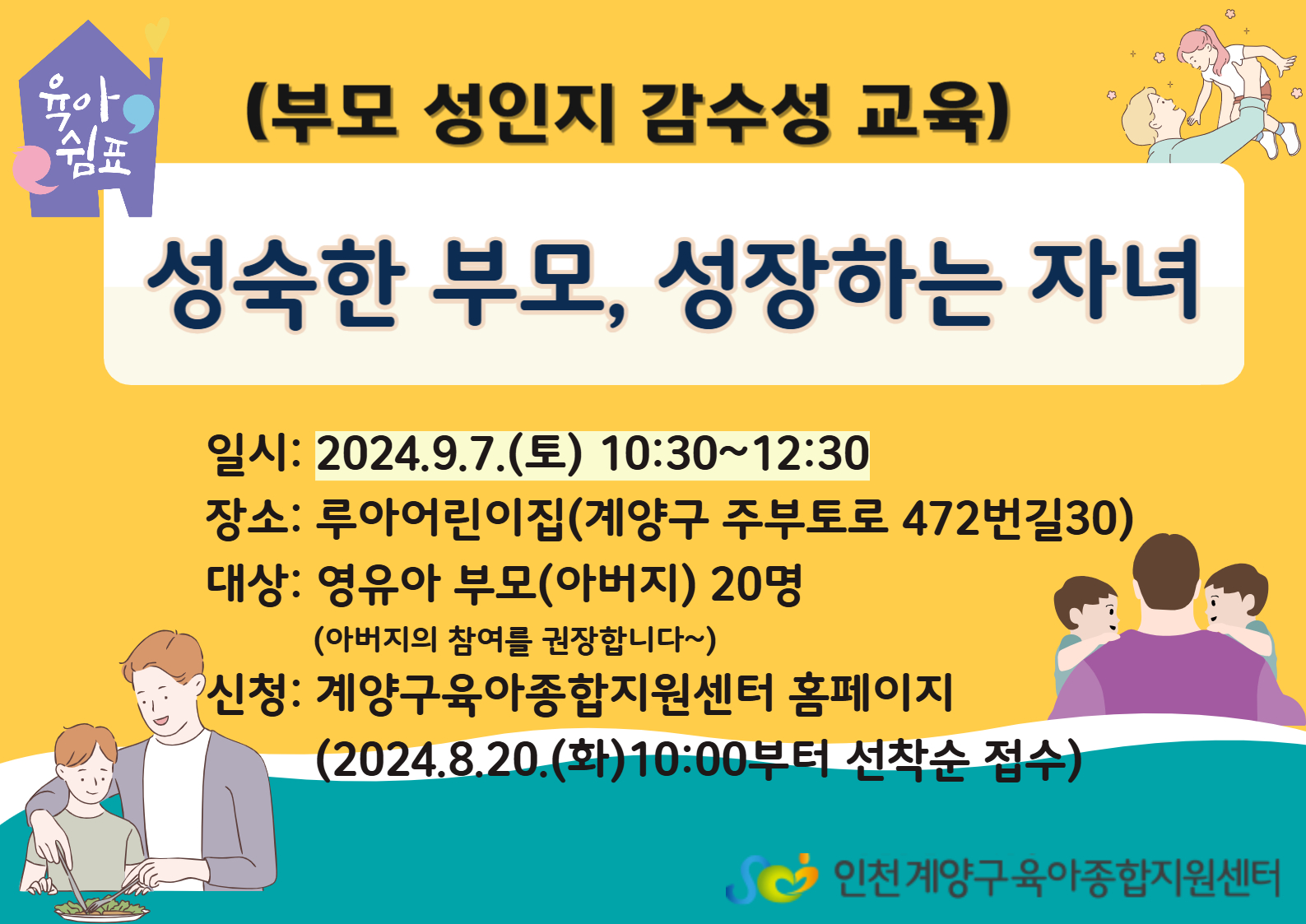 | 기타사항 | 본 교육은 아버지 교육으로 아버지의 참여를 권장합니다 (교육을 희망하실 경우 어머님의 참여도 가능합니다) 부부가 참여하실 경우에는 각각 신청해 주시기 바랍니다. ?(유아 동반시에는 보육이 제공됩니다) |