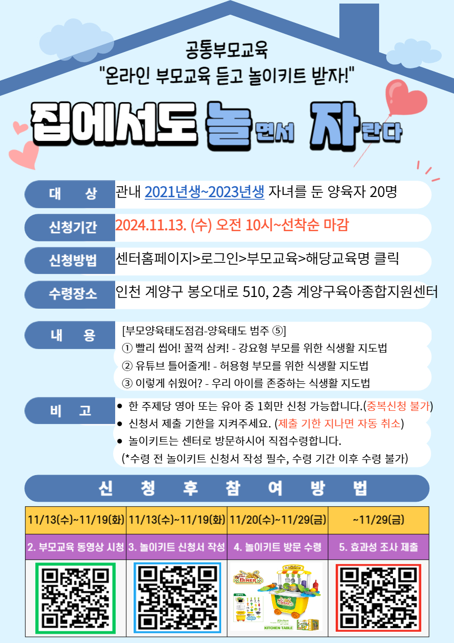 | 기타사항 | - 자녀가 2021년생~2023년생 사이의 영아를 둔 양육자님들만 신청 가능합니다. (해당 연령이 아닌경우 자동취소) - 다자녀인 경우 한 주제당 1회만 신청 가능합니다. (한 주제에 영아, 유아 동시 신청 불가) - 신청서 제출 기간 및 놀이키트 수령기간을 꼭 지켜주세요. - 11월 16일과 11월 23일 교육에 참석하시는 분들에 한해 토요일 수령이 가능합니다. |