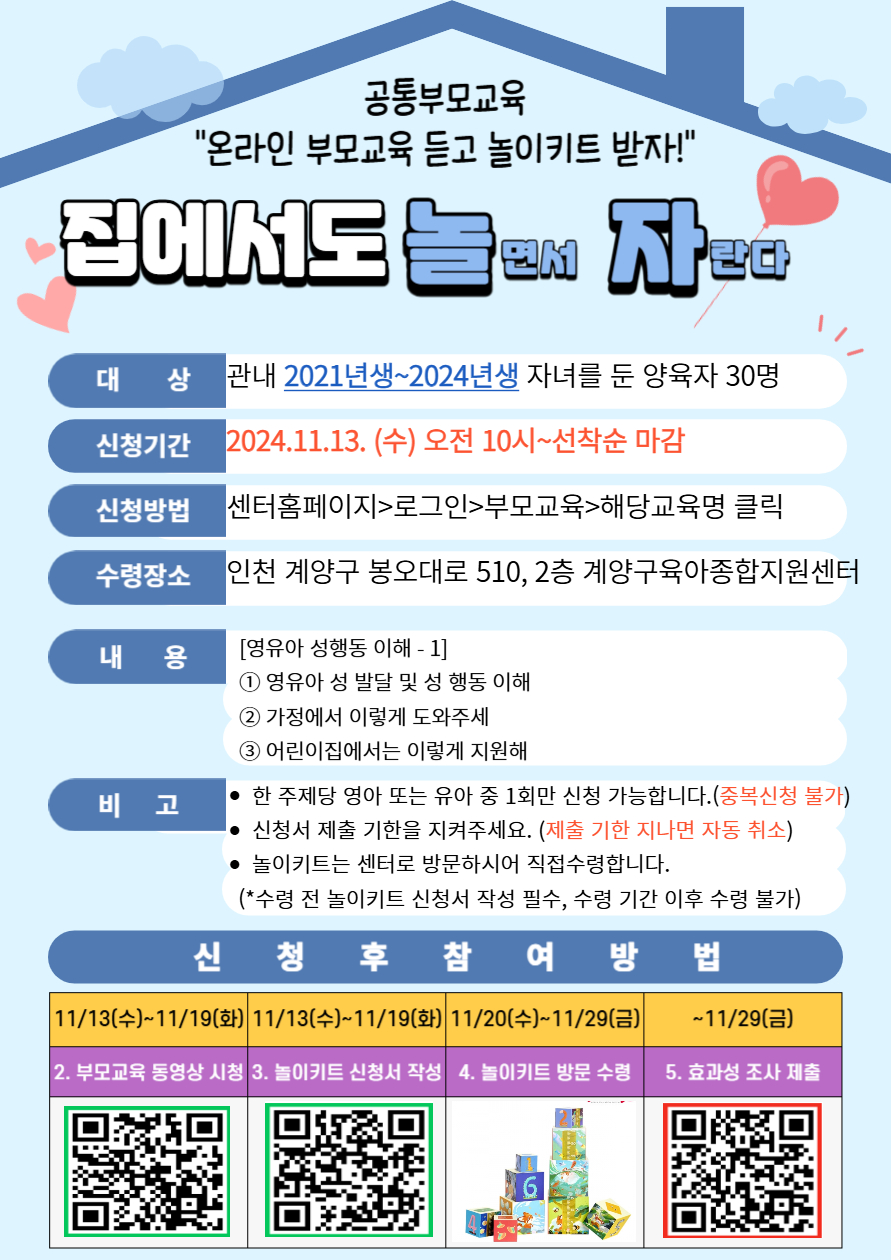 | 기타사항 | - 자녀가 2021년생~2024년생 사이의 유아를 둔 양육자님들만 신청 가능합니다. (해당 연령이 아닌경우 자동취소) - 다자녀인 경우 한 주제당 1회만 신청 가능합니다. (한 주제에 영아, 유아 동시 신청 불가) - 신청서 제출 기간 및 놀이키트 수령기간을 꼭 지켜주세요. - 11월 16일과 11월 23일 교육에 참석하시는 분들에 한해 토요일 수령이 가능합니다. |
