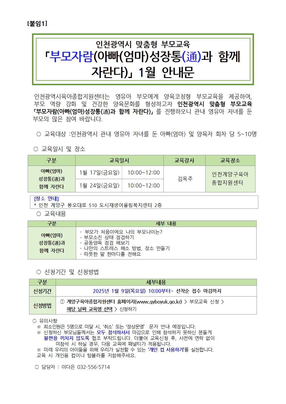 인천광역시 맞춤형 부모교육 부모자람(아빠 엄마 성장통(通)과 함께 자란다)