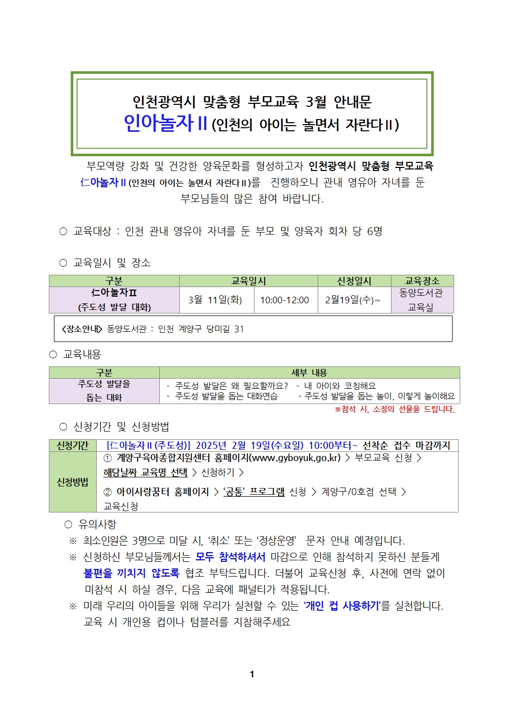 | 기타사항 | **참여 안내 및 유의사항** ※3가족 미만 신청 시 교육이 취소될 수 있습니다. (취소 시 전화 혹은 문자로 안내드리겠습니다.) ※신청하신 부모님들께서는 모두 참석해 주시기 바랍니다. 마감으로 인해 참석하지 못하신 분들께 불편을 끼치지 않도록 협조 부탁드립니다. ※부득이한 사정으로 취소 시, 반드시 전화로 연락해 주세요 (032-556-5714) |