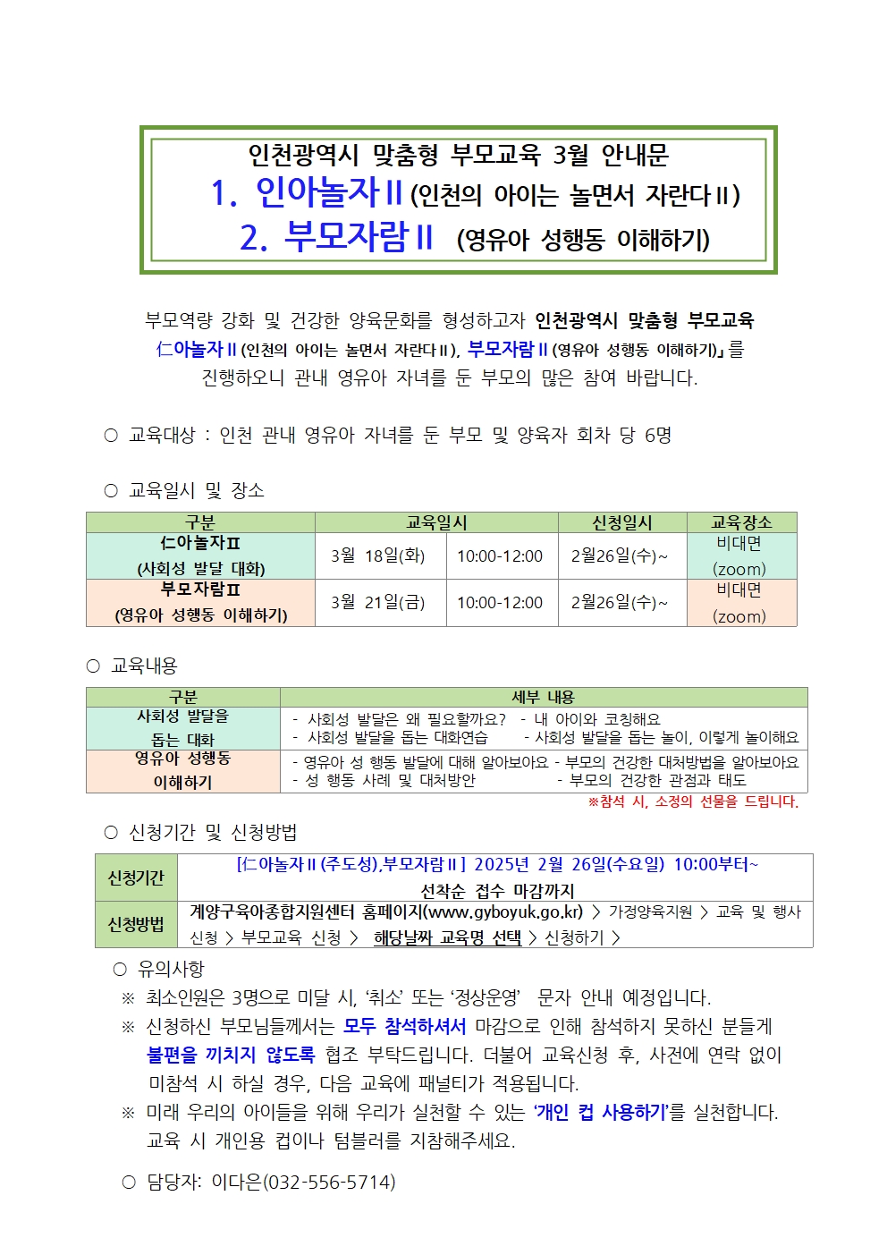| 기타사항 | **참여 안내 및 유의사항** ※3가족 미만 신청 시 교육이 취소될 수 있습니다. (취소 시 전화 혹은 문자로 안내드리겠습니다.) ※신청하신 부모님들께서는 모두 참석해 주시기 바랍니다. 마감으로 인해 참석하지 못하신 분들께 불편을 끼치지 않도록 협조 부탁드립니다. ※부득이한 사정으로 취소 시, 반드시 전화로 연락해 주세요 (032-556-5714). |