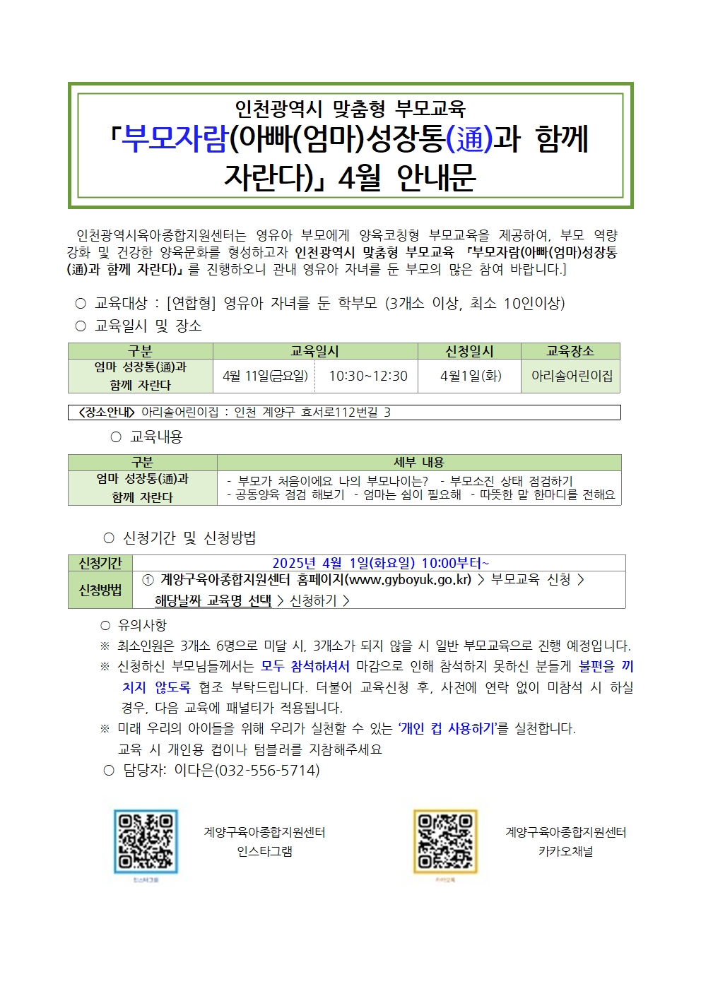| 기타사항 | *어린이집 연합형 부모교육임으로 어린이집만 신청가능합니다. | ||