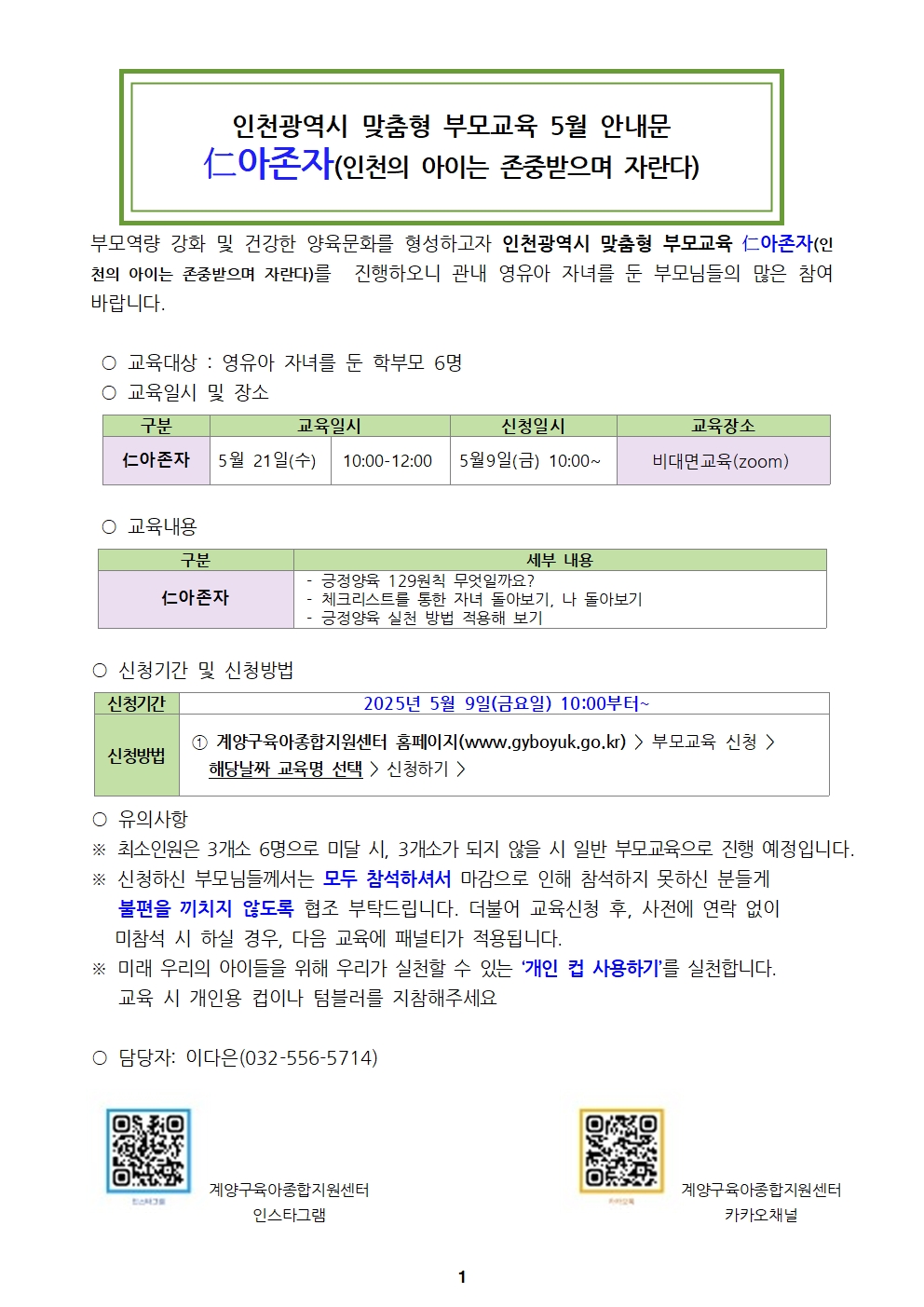 | 기타사항 | **참여 안내 및 유의사항** ※5명 미만 신청 시 교육이 취소될 수 있습니다. (취소 시 전화 혹은 문자로 안내드리겠습니다.) ※신청하신 부모님들께서는 모두 참석해 주시기 바랍니다. 3회이상 미참여시 다음 체험 및 교육신청에 제한됩니다. ※취소 시, 반드시 전화로 연락해 주세요 (032-556-5714). ※교재는 우편 발송되며, 당일 교육에 불참할 경우 다음 교육 및 체험 신청이 제한되니 꼭 수강하실 분만 신청해주세요. ※본 교육은 비대면 ZOOM교육으로 강사-부모 간 원활한 소통을 위하여 카메라 활성화 필수입니다. |