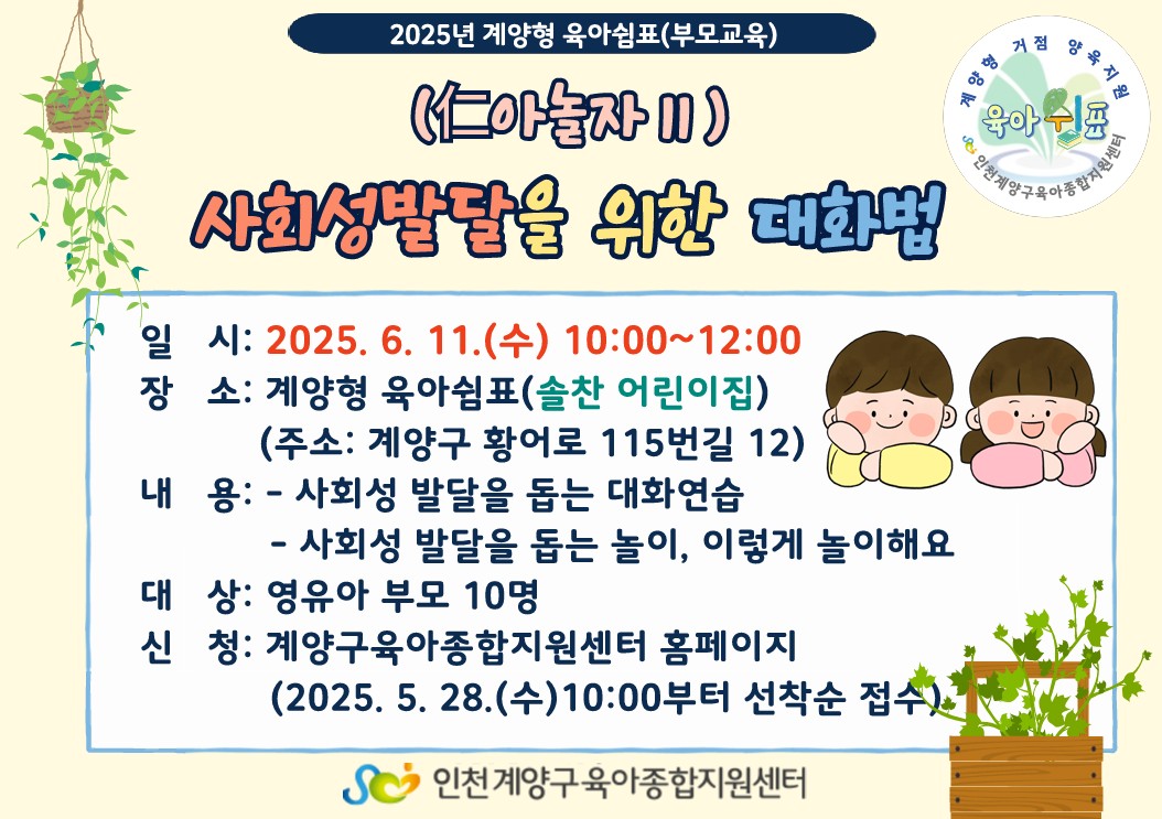 | 기타사항 | 계양형 육아쉼표 교육으로 지역의 거점어린이집에서 진행됩니다. 교육 장소는 솔찬어린이집 입니다. (계양구 황어로 115번길 12) |