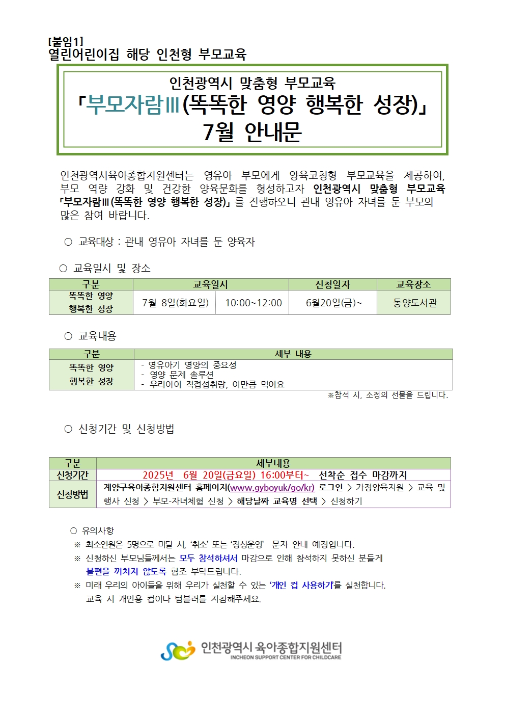 | 기타사항 | **참여 안내 및 유의사항** ※5명 미만 신청 시 교육이 취소될 수 있습니다. (취소 시 전화 혹은 문자로 안내드리겠습니다.) ※신청하신 부모님들께서는 모두 참석해 주시기 바랍니다. 3회이상 미참여시 다음 체험 및 교육신청에 제한됩니다. ※취소 시, 반드시 전화로 연락해 주세요 (032-556-5714). |
