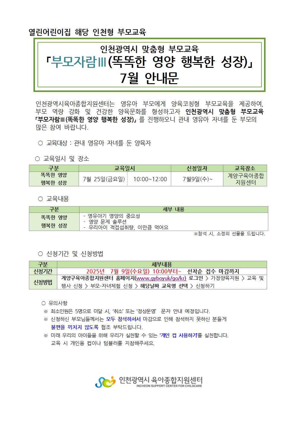 | 기타사항 | **참여 안내 및 유의사항** ※5명 미만 신청 시 교육이 취소될 수 있습니다. (취소 시 전화 혹은 문자로 안내드리겠습니다.) ※신청하신 부모님들께서는 모두 참석해 주시기 바랍니다. 3회이상 미참여시 다음 체험 및 교육신청에 제한됩니다. ※취소 시, 반드시 전화로 연락해 주세요 (032-556-5714). |