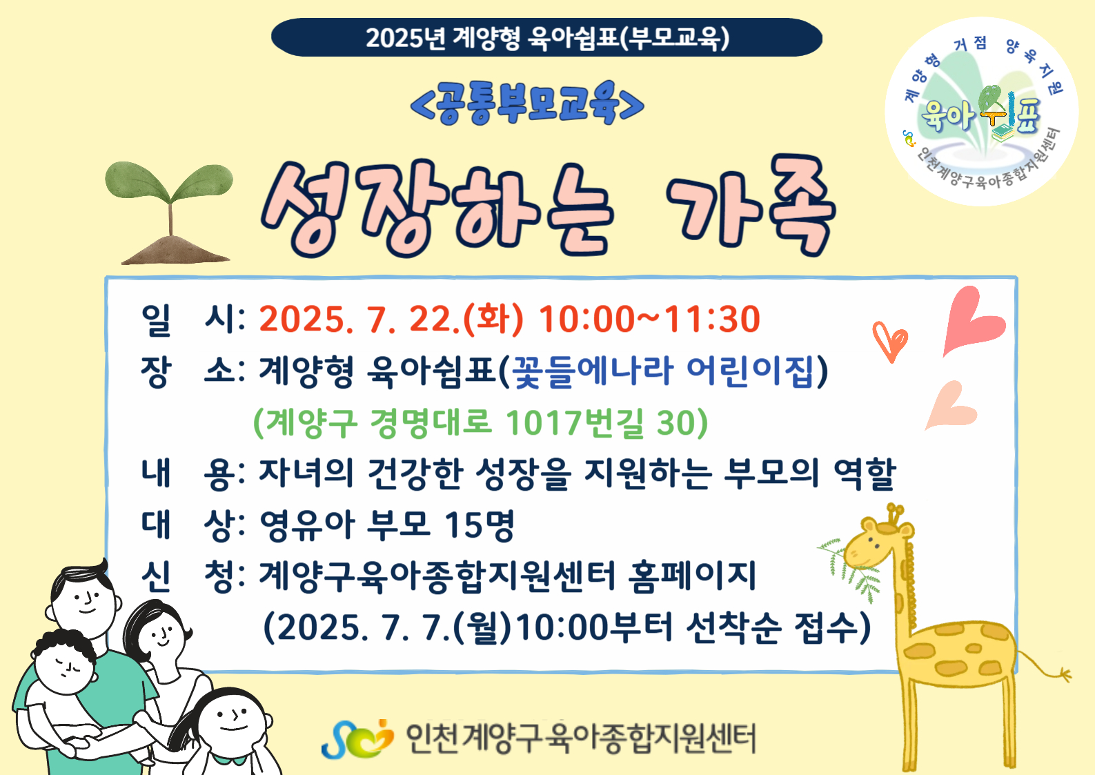 | 기타사항 | 계양형 육아쉼표 교육으로 지역의 거점어린이집에서 진행됩니다. 교육 장소는 꽃들에나라 어린이집 입니다. (계양구 경명대로 1017번길 30) |
