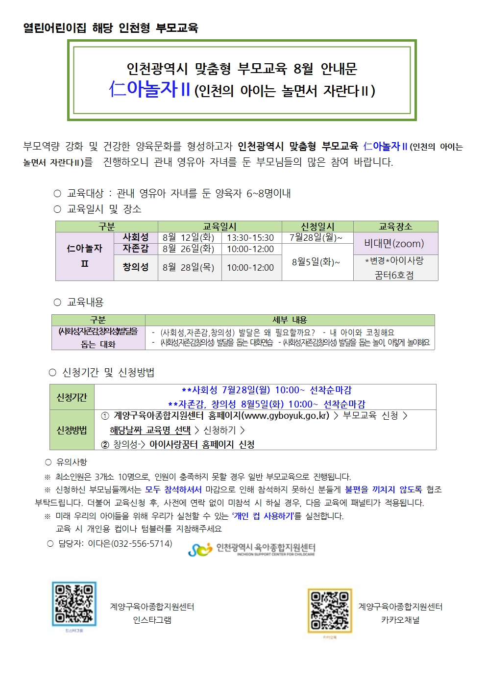 | 기타사항 | **참여 안내 및 유의사항** ※5명 미만 신청 시 교육이 취소될 수 있습니다. (취소 시 전화 혹은 문자로 안내드리겠습니다.) ※신청하신 부모님들께서는 모두 참석해 주시기 바랍니다. 3회이상 미참여시 다음 체험 및 교육신청에 제한됩니다. ※취소 시, 반드시 전화로 연락해 주세요 (032-556-5714) ※본 교육은 비대면 ZOOM교육으로 강사-부모 간 원활한 소통을 위하여 카메라 활성화 필수입니다. |