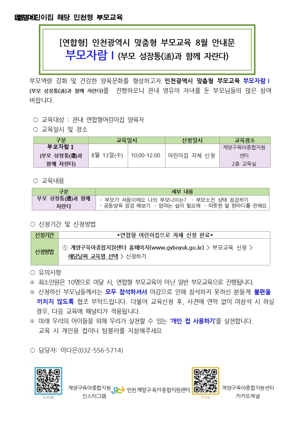 | 기타사항 | **어린이집 연합형 부모교육입니다** | ||
