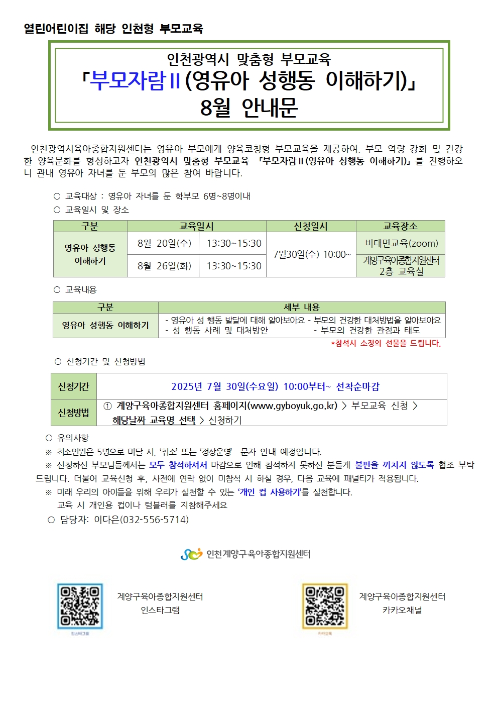 | 기타사항 | **참여 안내 및 유의사항** ※5명 미만 신청 시 교육이 취소될 수 있습니다. (취소 시 전화 혹은 문자로 안내드리겠습니다.) ※신청하신 부모님들께서는 모두 참석해 주시기 바랍니다. 3회이상 미참여시 다음 체험 및 교육신청에 제한됩니다. ※취소 시, 반드시 전화로 연락해 주세요 (032-556-5714). |