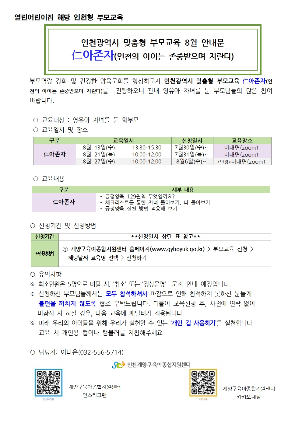 | 기타사항 | **참여 안내 및 유의사항** ※5명 미만 신청 시 교육이 취소될 수 있습니다. (취소 시 전화 혹은 문자로 안내드리겠습니다.) ※신청하신 부모님들께서는 모두 참석해 주시기 바랍니다. 3회이상 미참여시 다음 체험 및 교육신청에 제한됩니다. ※취소 시, 반드시 전화로 연락해 주세요 (032-556-5714). ※본 교육은 비대면 ZOOM활용으로 강사-부모 간 원활한 소통을 위하여 카메라 활성화 필수입니다. |