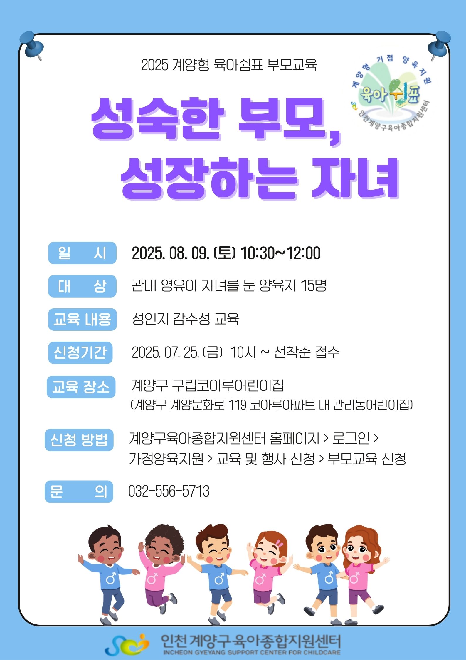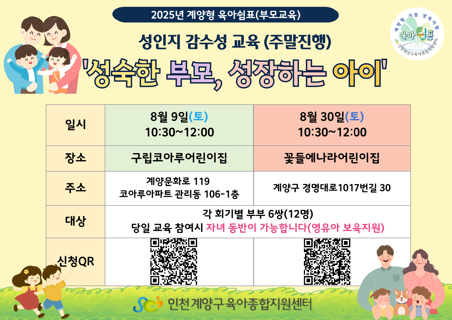 | 기타사항 | 계양형 육아쉼표 교육으로 지역의 거점어린이집에서 진행됩니다. 교육 장소는 코아루어린이집 입니다. (계양구 계양문화로119 코아루아파트 관리동어린이집 106-1층) |