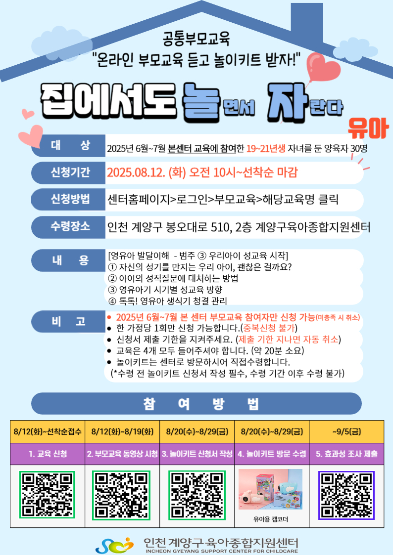 | 기타사항 | **2025년 6~7월 본센터 부모교육 참여자만 신청 가능합니다** **한 아이디당 영아 또는 유아 한개만 신청 가능합니다** |