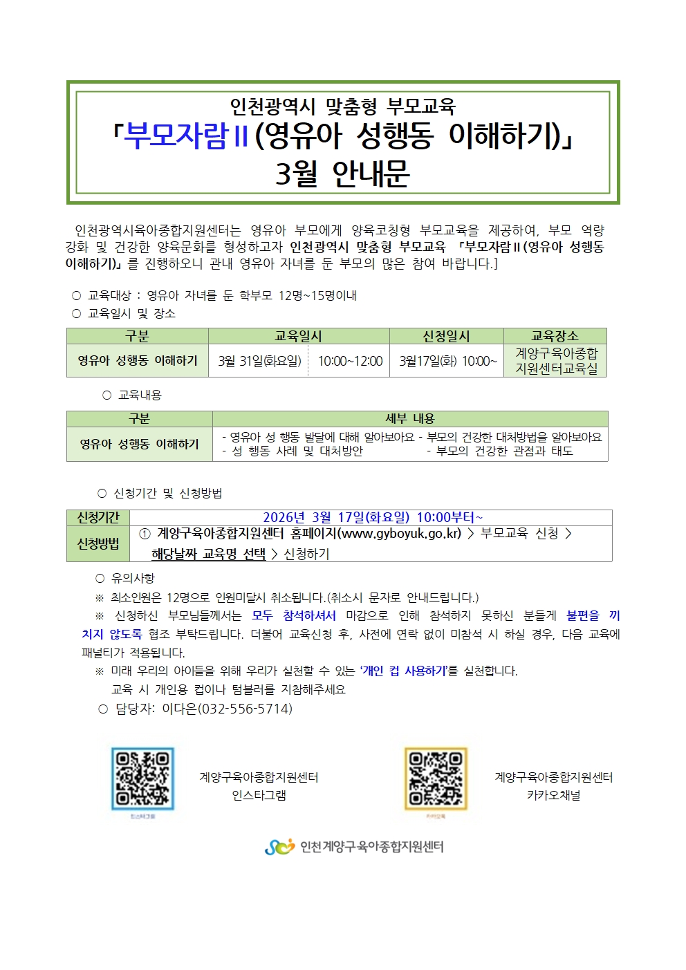 | 기타사항 | **참여 안내 및 유의사항** ※10명 미만 신청 시 교육이 취소될 수 있습니다. (취소 시 전화 혹은 문자로 안내드리겠습니다.) ※신청하신 부모님들께서는 모두 참석해 주시기 바랍니다.당일취소 및 무단불참시 체험 및 교육신청에 제한됩니다. ※취소 시, 반드시 전화로 연락해 주세요 (032-556-5714). |
