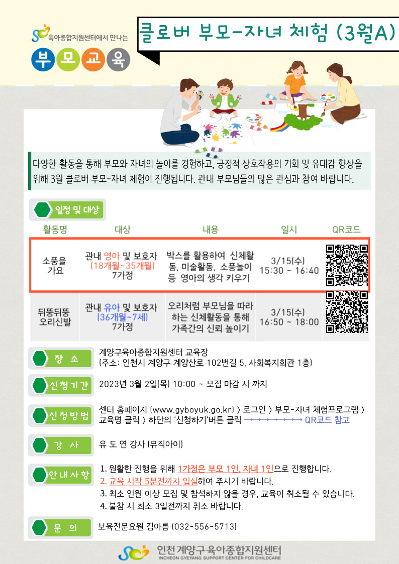| 기타사항 | *상기 일정은 센터 사정에 의해 변경될 수 있습니다. *자녀는 꼭 1명만 등록하여 주시기 바랍니다. |